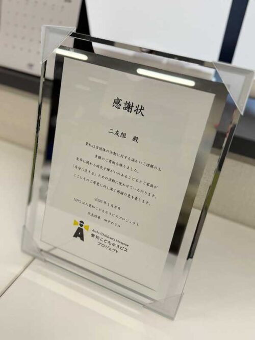 愛知こどもホスピス様より感謝状を頂きました トピックス 2026.02.12 生命を脅かされる病気や障害のあるこどもとそのきょうだい・家族がのびのびと楽しく思いきり、どんな時も子どもらしい時間を過ごせるためのこどもホスピス活動をNIYUグループは、応援します。