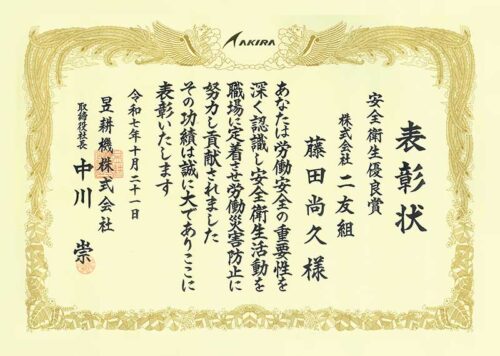昱耕機株式会社様より表彰状を頂きました ニュース 2026.02.14 令和7年10月21日 株式会社二友組 藤田の災害防止に努力貢献した功績を評価していただきました。 社員一同、今後も安心・安全を心掛けより信頼される共生企業を目指してまいります。 この度は誠にありがとうございました。