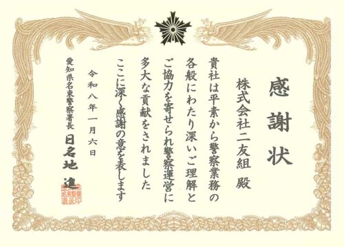 愛知県名東警察署より感謝状を頂きました